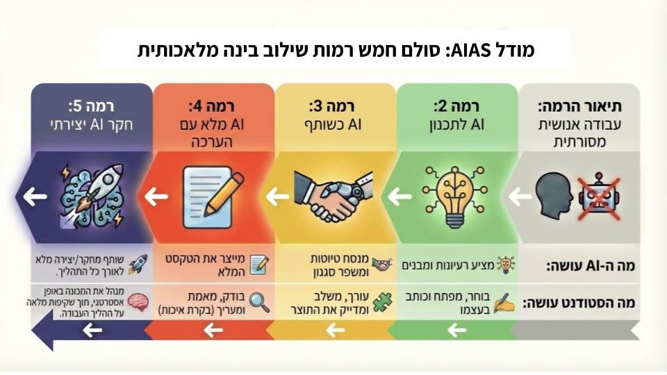 המודל הינו סולם בן 5 רמות שילוב של AI – מאיסור מוחלט ועד שותפות מלאה – שנועד להפוך את ה-AI  מכלי 'מבצע' המחליף את הסטודנט, ל'פיגום' שתומך בלמידה שלו (קישור למחקר באנגלית). המודל מעניק לנו כלי עבודה יישומי, המחליף את ההנחיות הכלליות והמעורפלות בהגדרות פדגוגיות מדוייקות. באמצעותו נוכל להגדיר מהם רכיבי הליבה במטלה שחשוב לנו שהסטודנט יבצע בעצמו, ולגזור מכך את המינון והשלב הנכון לשימוש ב-AI.