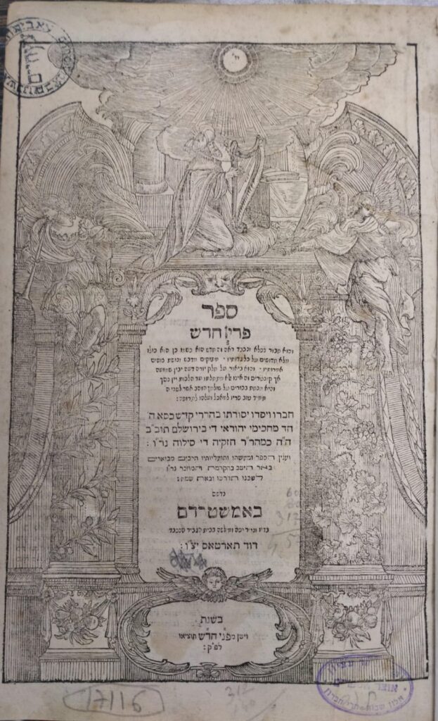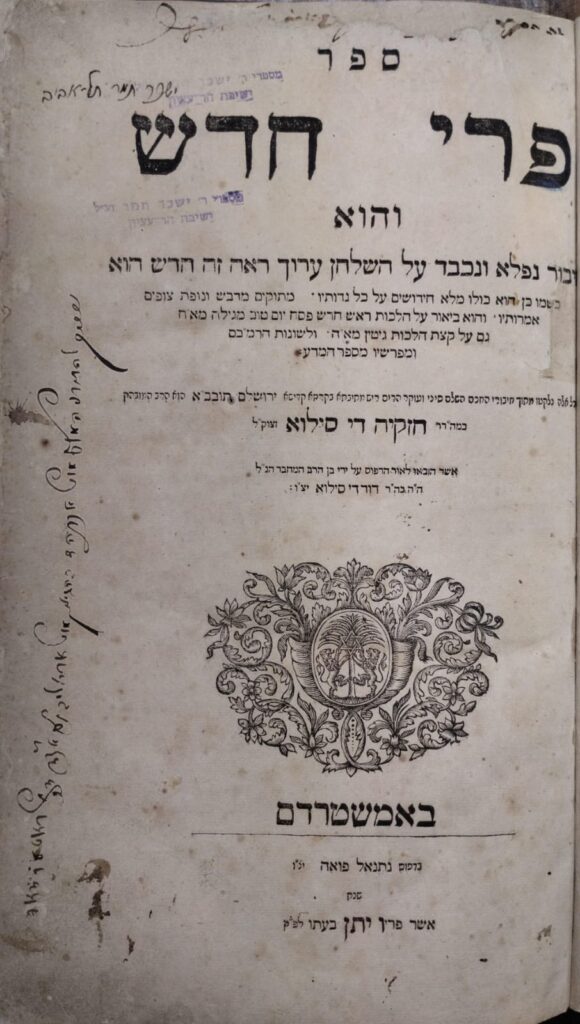 מסתבר שבזמן שהותו של הרח"ד באמשטרדם ועבודתו על סיום כתיבת ה'פרי חדש' הוא ישב בספריה החשובה של בית המדרש 'עץ חיים' ספרדי, שנוסדה עוד ב- 1639 ועברה למשכן הקבע שלה בבית הכנסת הפורטוגזי החל מ- 1675 ושם היא נמצאת עד עצם היום הזה. הספריה של בית המדרש עץ חיים – אשכנזי הנמצאת היום בחדר אמשטרדם שבספריתנו – נוסדה רק בשנים יותר מאוחרות, אולם ככל הנראה חלק מן הספרים הישנים שבה, נאספו מבתי הכנסת האשכנזים של אמשטרדם, ומי יודע אולי רח"ד למד גם בהם (ביינתיים לא מצאנו הערות שלו בשולי הספרים שברשותנו…). כמובן שהמהדורה הראשונה של הספר נמצאת ב'חדר אמשטרדם' אשר בספריתנו.