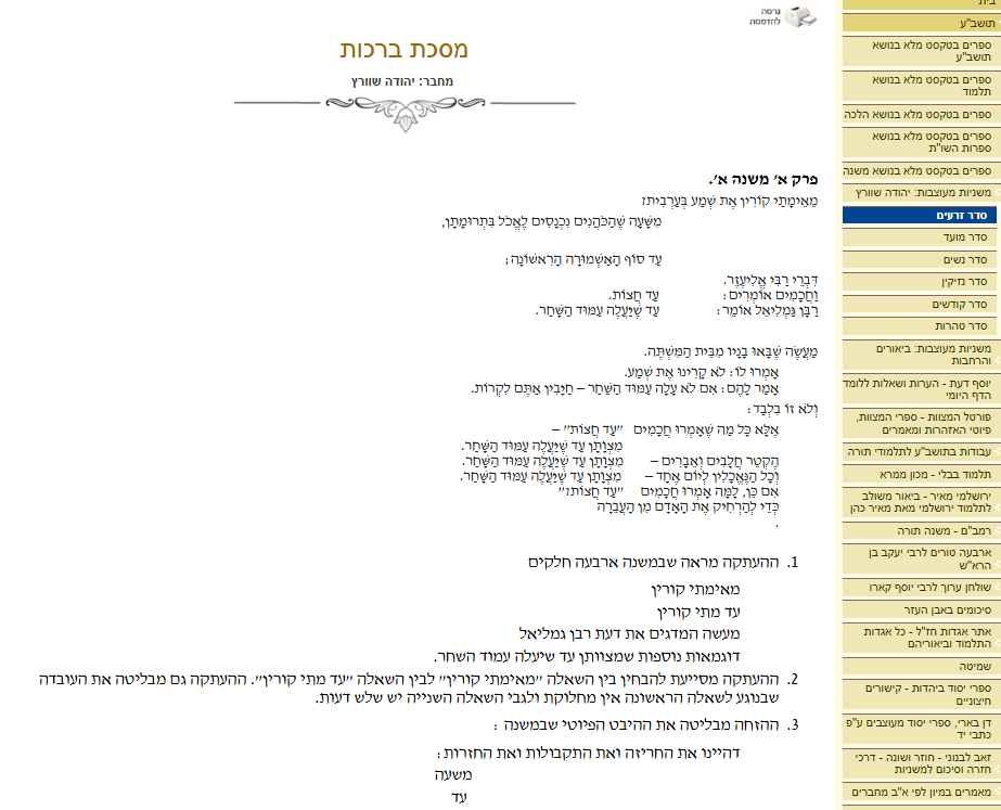 "אחד הקשיים העומדים בפני תלמידינו, הוא הלימוד מתוך טקסט רצוף, בלתי מחולק, כמקובל בדפוסי המשנה השונים (כמו סיפור ולא כמו שיר!). ראוי להציע כי בראשית לימוד המשנה יקבלו התלמידים בצד הטקסט בדפוס המסורתי ומשנה עם ברטנורא או משנה עם פירוש קהתי), את הטקסט של המשנה בהדפסה מיוחדת, המציעה את המשניות כנתינתן ממנסחי המשנה, בצורה שקולה, מעוצבת ושירית. צורה זו תסייע להבנה, ותדרבן או התלמידים ליצירתיות, לפיתוח, לשאלות, ולגילוי דיוקים שונים. הרגלים אלה יאפשרו למתקדמים שבין תלמידינו, להציג לעצמם, בהמשך הלימוד, את המשניות כראוי, על פי הדוגמאות שלמדו בראשית לימודם. שלב זה יאפשר בדיקת אלטרנטיבות שונות וויכוח פורה בין הלומדים. להלן דוגמאות אחדות של משניות המועתקות כפי שנראה לנו להציע אותן בפני הלומדים. הקוראים בוודאי יגלו בעיון בכל אחת מן המשניות את המיוחד בניסוח, או את המעניין בצורת ההעתקה, או את המועיל בצורת ההוראה. כאן המקום להדגיש כי הצעתנו היא ראשית דבר, ולא סופו. שימוש בשיטה זו מאפשר המשך הלימוד בשיטות אחרות, פרשניות, הלכתיות, או מעשירות בכיוונים שונים"